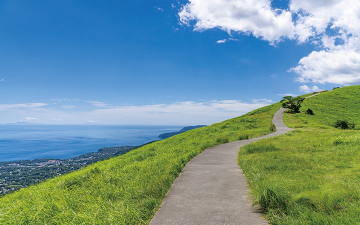 大室山では、1 周1km の山頂遊歩道を30分かけて散歩する「お鉢巡り」も人気。伊豆諸島や富士山を360 度の大パノラマで楽しめるだけでなく、火口跡ではアーチェリー体験ができる。